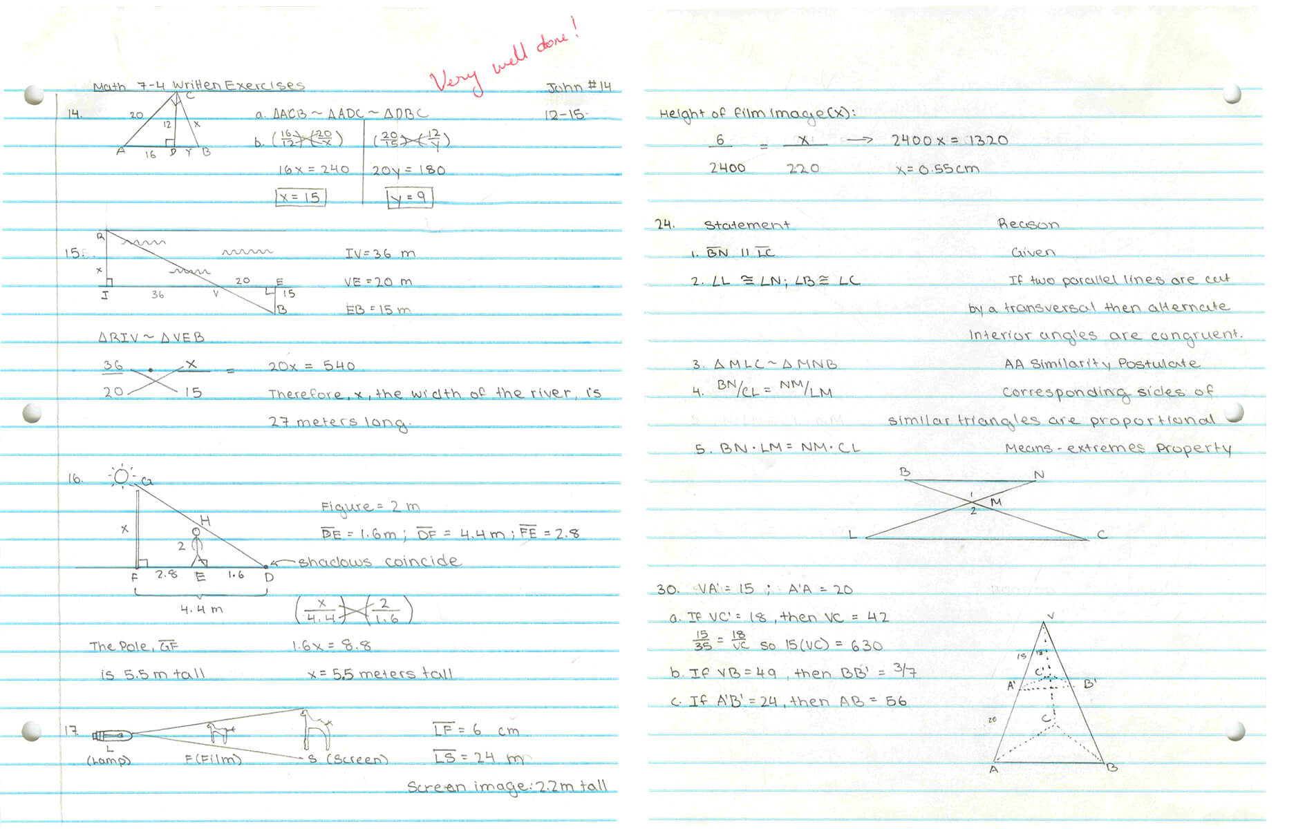 This student’s geometry classwork demonstrates excellent reasoning skills. He proficiently uses theorems to determine the calculations needed to solve real-life scenarios involving similar triangles.