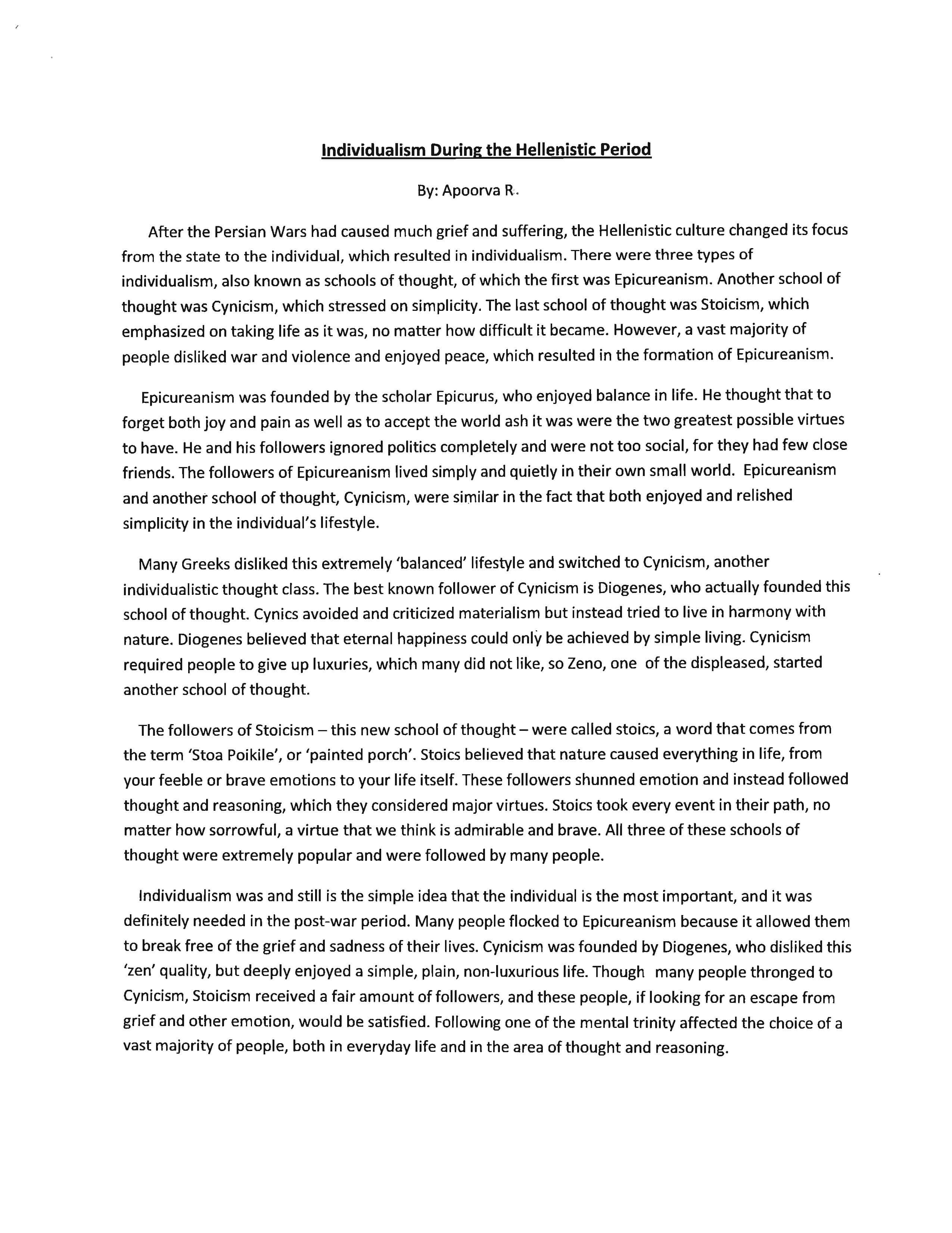 In this composition, the student describes the three schools of Individualism that emerged during Greece’s Golden Age following the reign of Alexander the Great. Not only does she exhibit an excellent command of essay organization, vocabulary, grammar, and mechanics, but she also skillfully explains the principles and influences of each of these schools of thought.