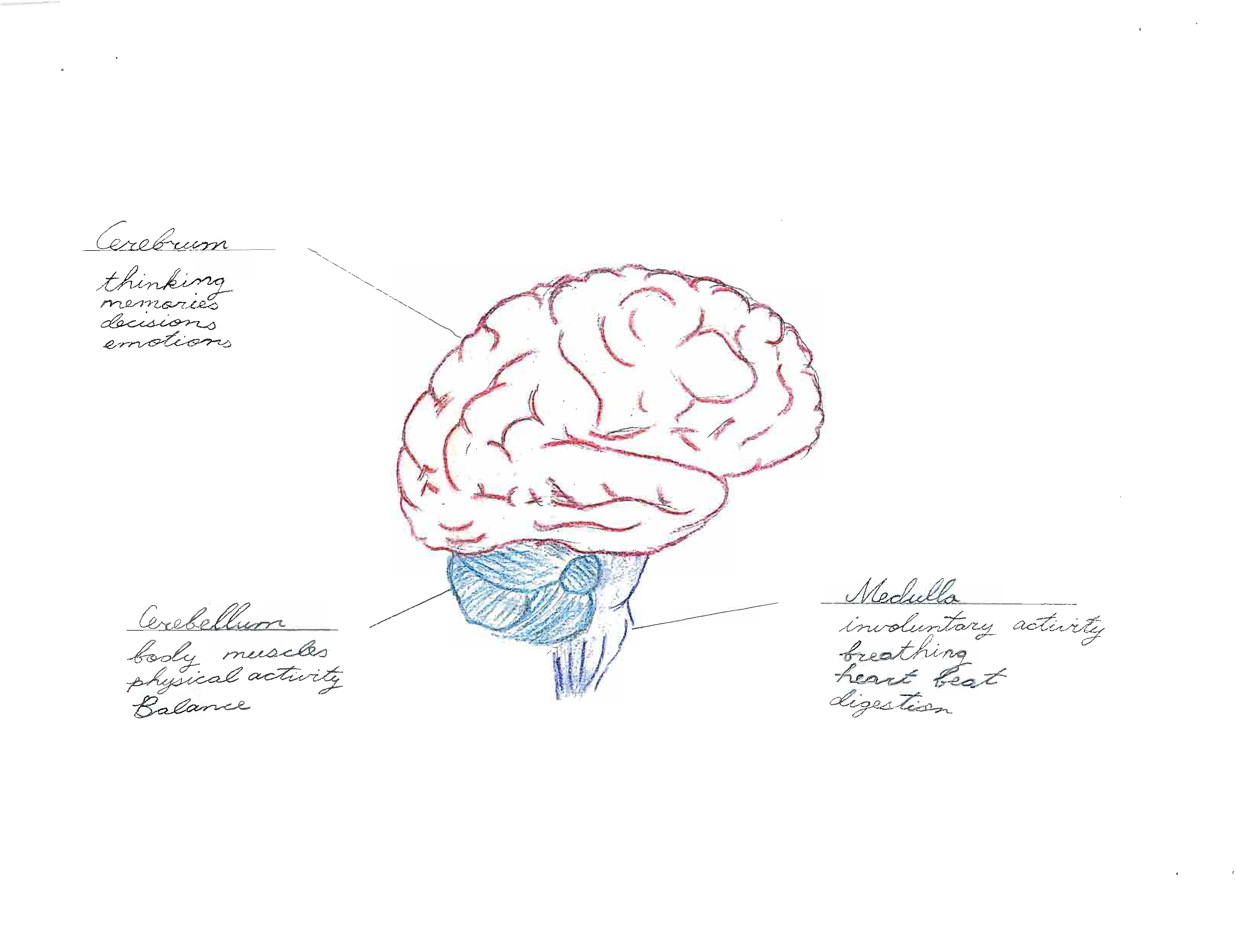 This student, following a series of verbal instructions, draws and identifies the regions of the brain and their various functions. She shows a clear understanding of the concepts while creating a neat and accurate diagram.