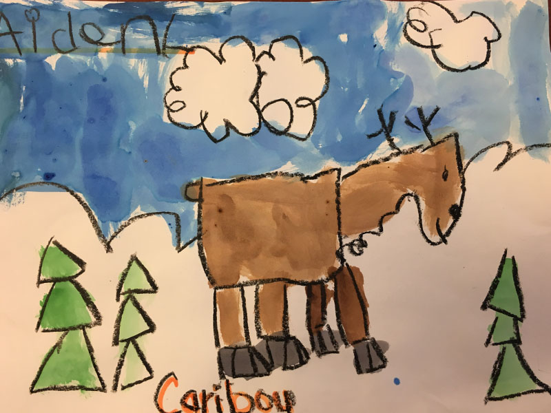 This preschooler uses the shapes that make up a caribou and recreates the animal using rectangles and triangles. He uses crayon to outline and watercolors for color and plans ahead to allow uncolored space for clouds in the blue sky.