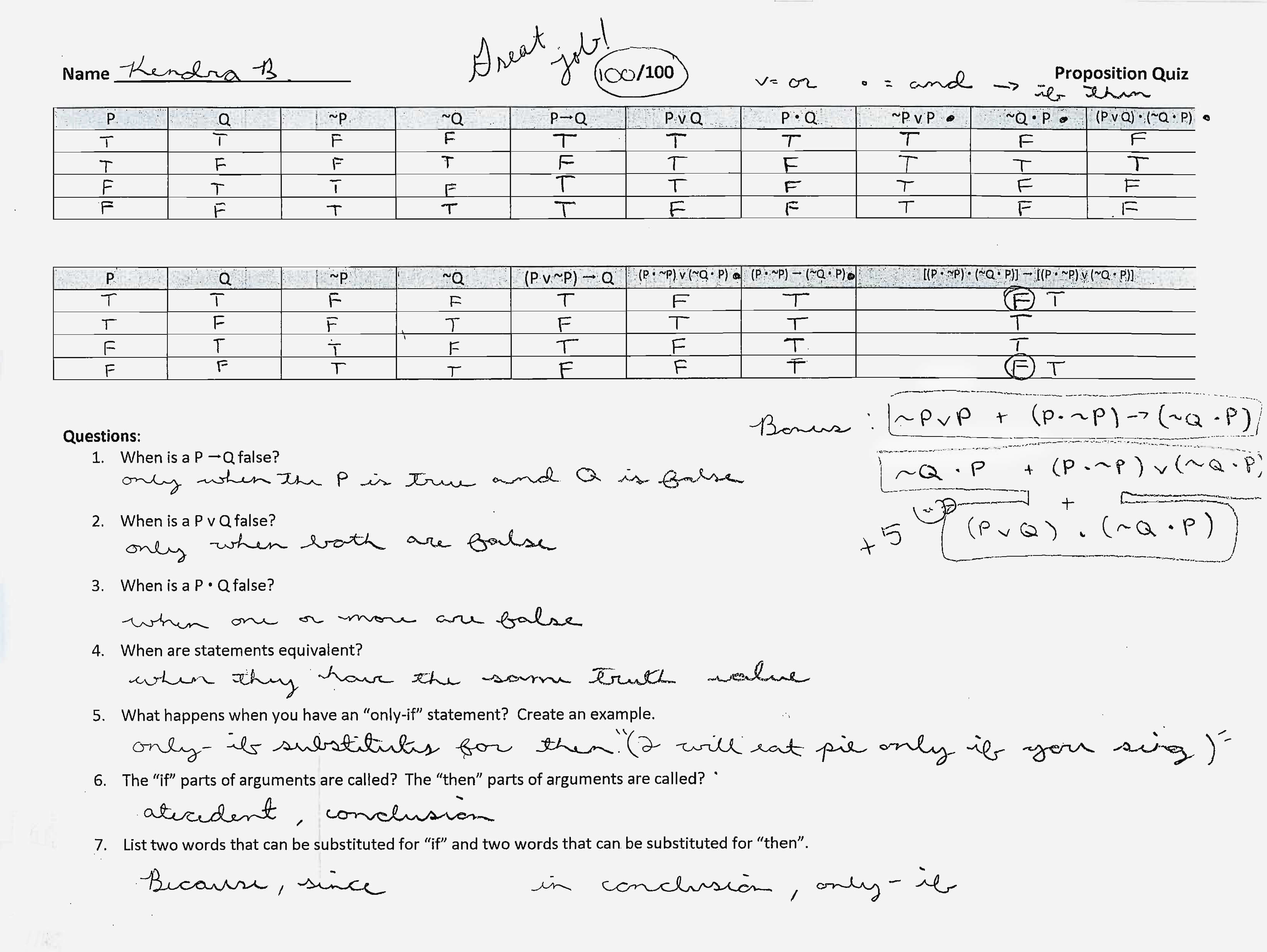 On this quiz on truth-functional propositional logic, the student perfectly identifies truth values, uses inference rules, and recognizes the functions of logical connectives. These premises are useful in everyday decision-making and argument analysis.