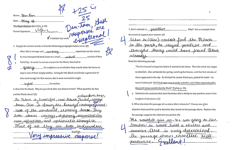 After reading a section of the novel The Black Stallion, this student’s short answer responses on a quiz exhibit both understanding and an impressive command of vocabulary.