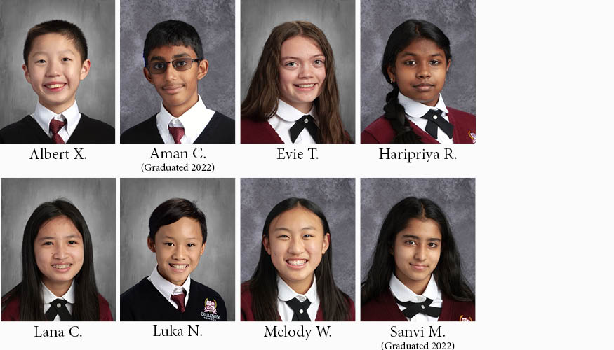 Eight Challenger students—Albert X. (Sandy, UT), Aman C. (Shawnee, CA), Evie T. (Sandy, UT), Haripriya R. (Shawnee, CA), Lana C. (Salt Lake, UT), Luka N. (Silverado, NV), Melody W. (Ardenwood, CA), and Sanvi M. (Strawberry Park, CA)—were recently named to the Top 300 of the prestigious Broadcom MASTERS 2022 competition due to their outstanding projects from last spring’s science fairs.